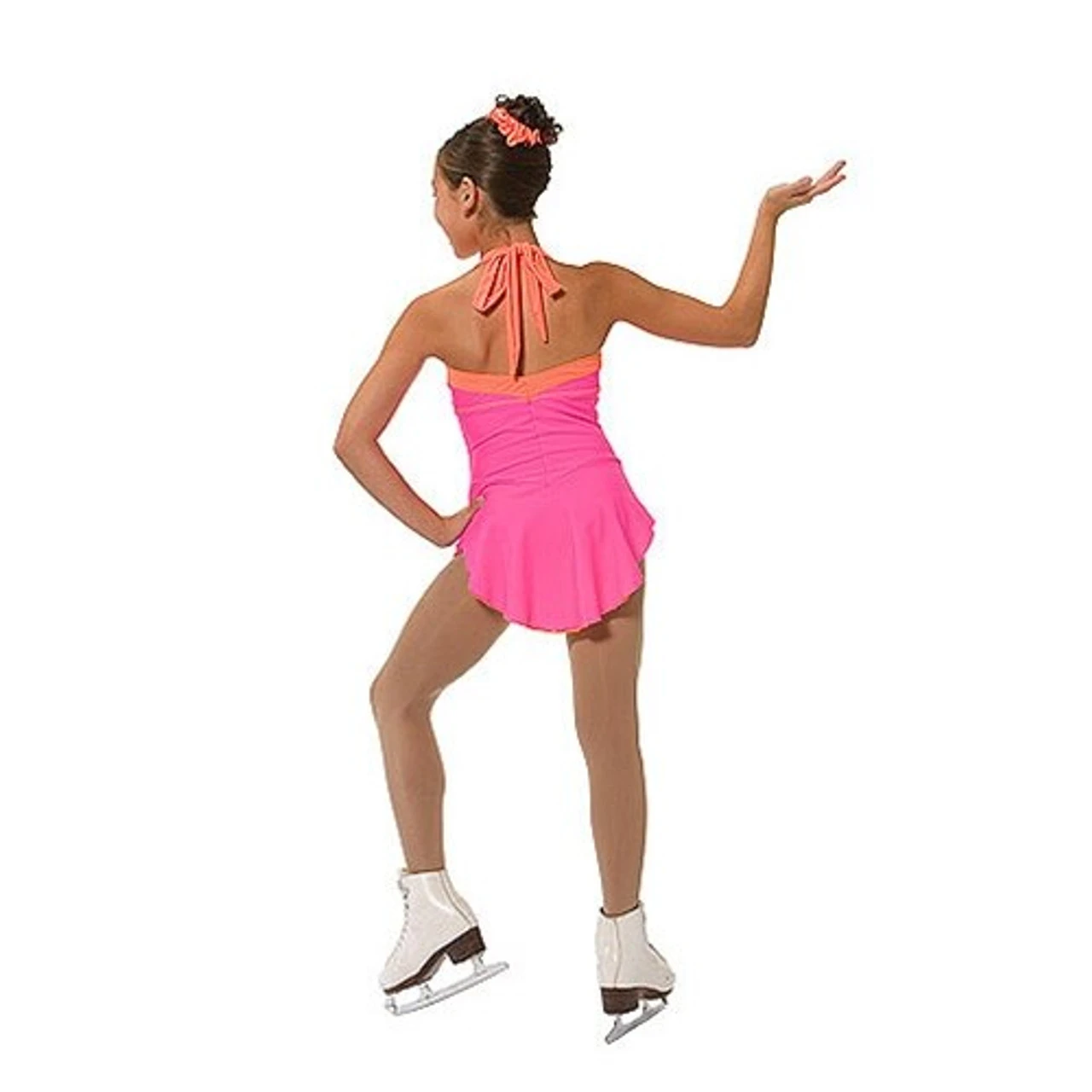 Darling tie-back halter dress in Italian matte tricot—feminine without fussy. Soft classic skirt in matching color with contrast (or matching mesh underneath–both with lettuce-edge. Bodice piped in contrast, and ties at neck back with solid lycra tie. Nude mesh inset at front bodice for stability.