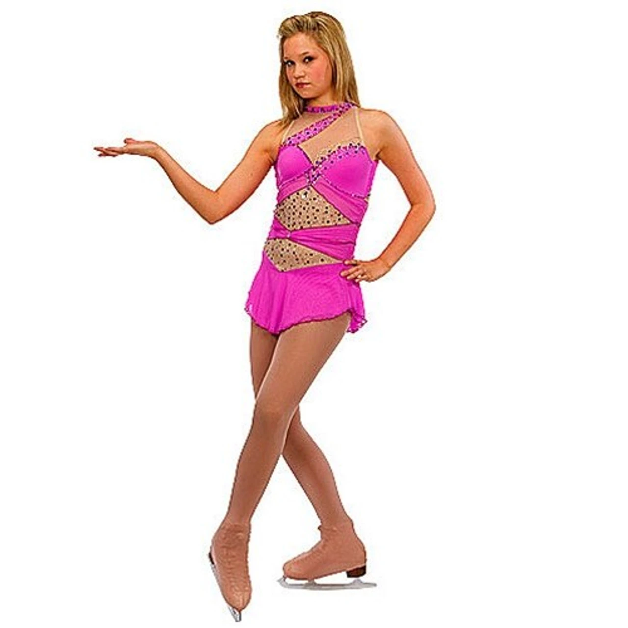 An exotic dress right out of Arabian Nights . . . our Italian matte tricot “persian dress” features asymetrical veils of stretch illusion mesh wrapping around the torso. Choker neckline closes with a hook. Flat closed-side double mesh skirt. This is a dress where crystaling makes all the difference–TONS!!