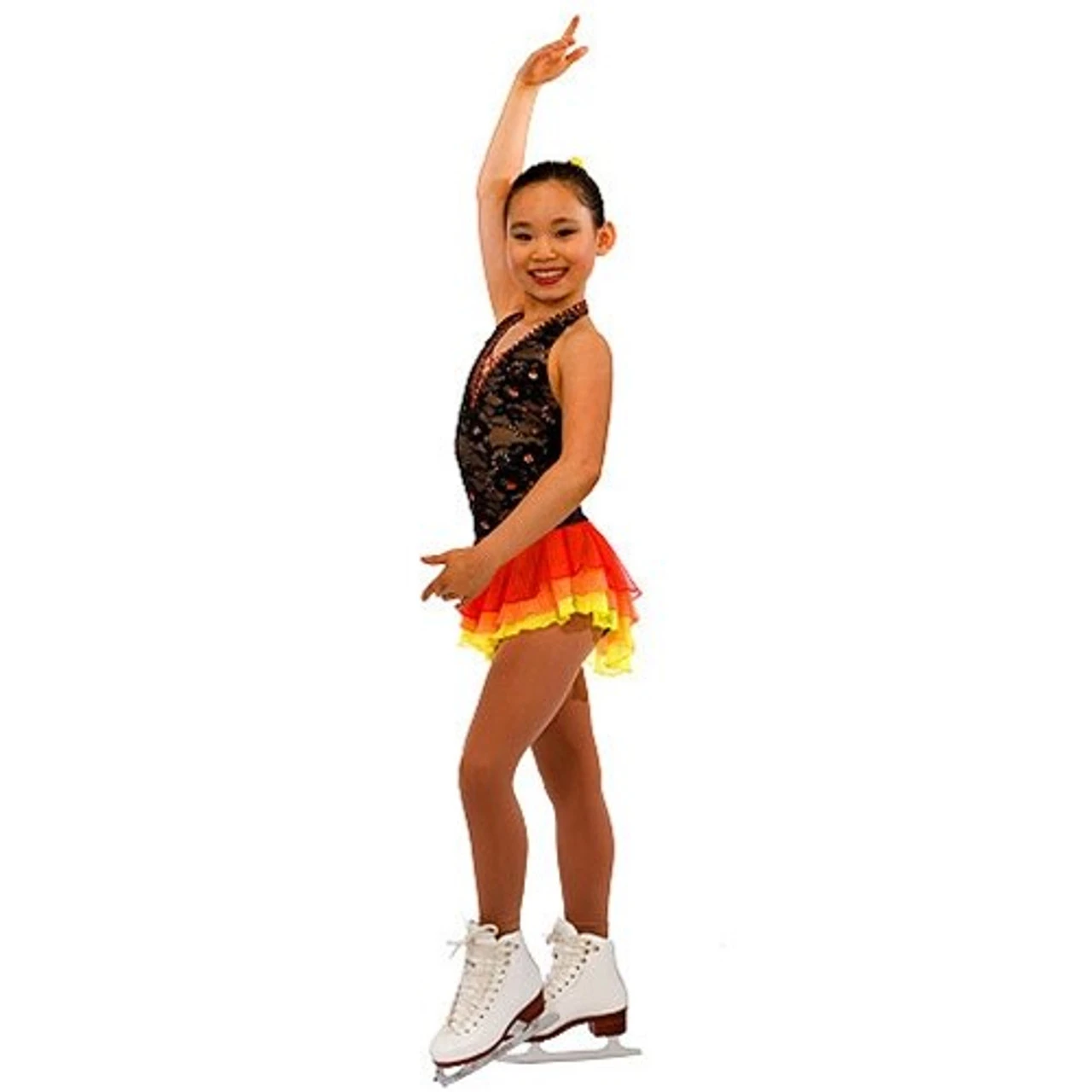 Flirty Spanish-styled dress for all ages. Softly gathered lace front bodice looks risque’ (but really isn’t with nude lining underneath). Low “V” neck supported by nude mesh. Halter hooks at back of neck with nude support across low, low back. Triple-layer skirt of stretch illusion mesh.