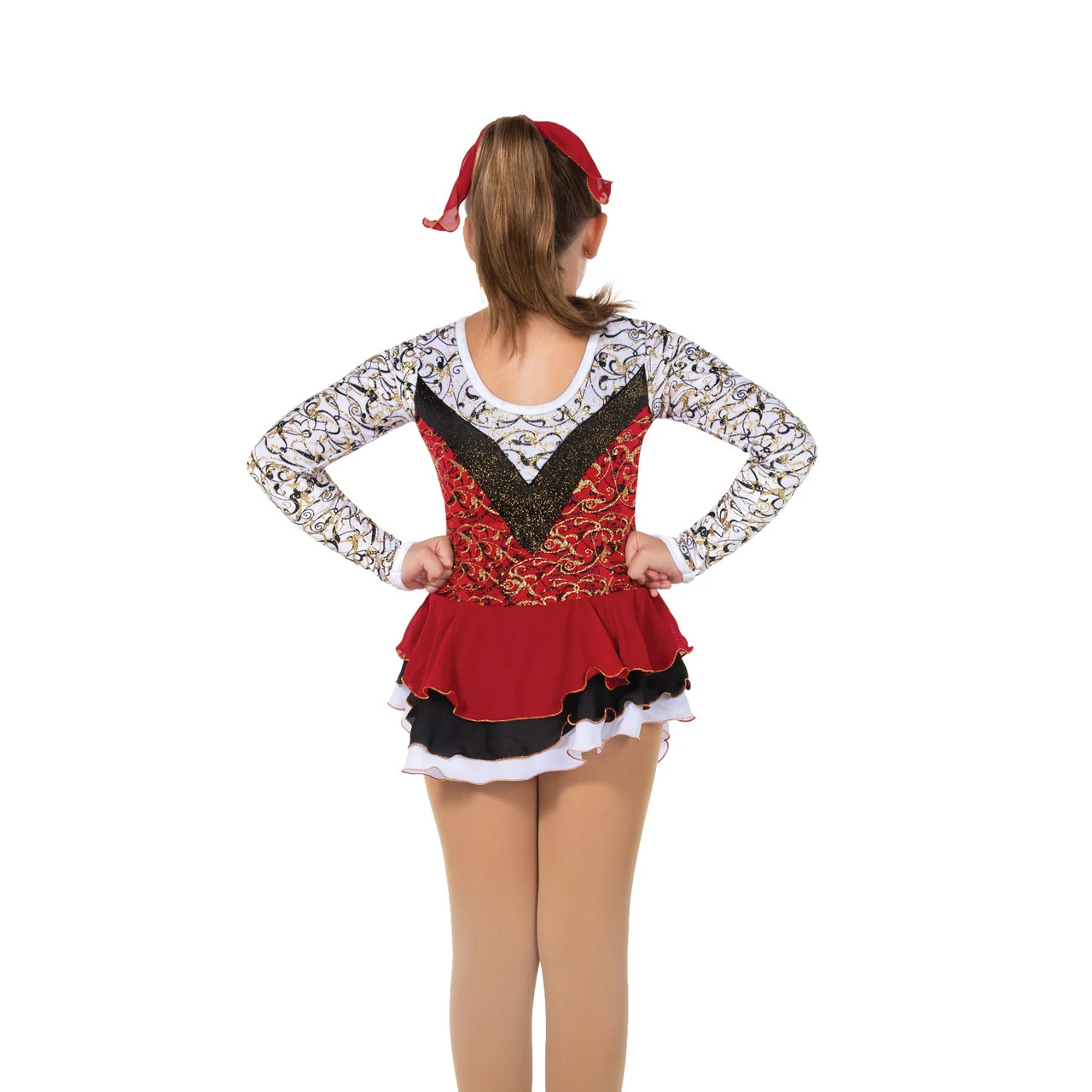 Classic red, black and white dress drizzled in gold and black glitter and accented with black shimmer velvet banding and a triple layer skirt edged in gold.