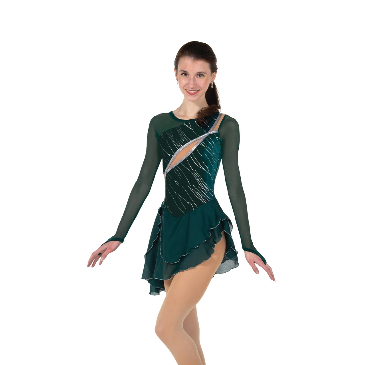 Dark ivy green dress with long mesh sleeves and a series of intertwined cutouts across the front, over one shoulder and spilling down the back. A slanted, layered georgette skirt edged in silver adds length to the slim look. Cutouts are trimmed in silver and fully lined for opacity.