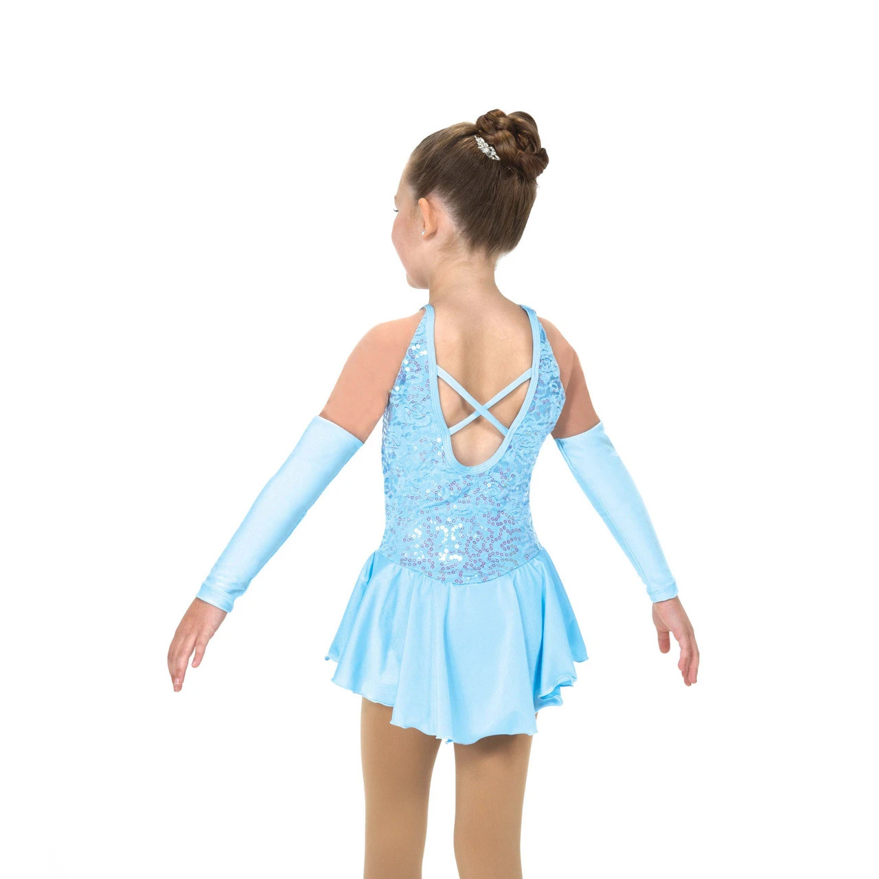 Sparkling iridescent sequin lace dresses in soft colours with glove look sleeves and skirts in matching lycra. A scoop back with crossed spaghetti straps add extra interest. Lined.
