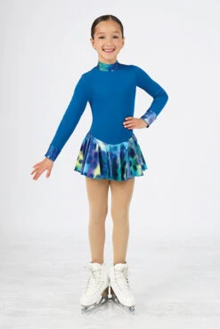 Solid color body, printed skirt, cuff and collar, zipper closing.
